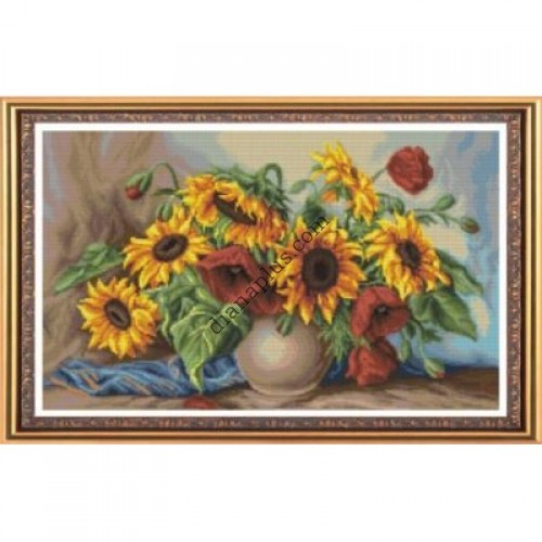 Дуже домашній і затишний сюжет! Набір для вишивання картини "Ваза з соняшниками і маками" прикрасить собою і квартиру, і заміський будинок, і дачу, а також може стати відмінним подарунком!