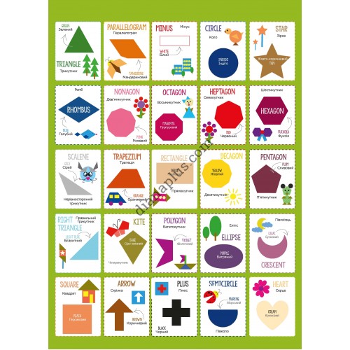Ваша дитина не бажає вивчати геометричні форми? Яскраві ілюстрації абетки містять яскраві картинки геометричних фігур українською та англійською мовами, вивчення яких буде корисним для вашої малечі. Також на звороті абетки є ілюстрація «Майбутній відмінник» про навчальні видання для дітей.