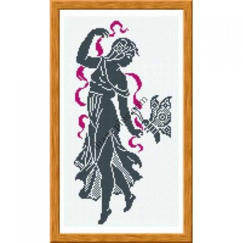 Вишивка чорним - сміливий вибір для картини! І головне тут - вдало підібраний сюжет. Силует античної німфи з яскравим акцентом ідеально підходить для чорного кольору. Адже саме так їх і зображували давні греки на своїх фресках та побутових предметах. Така картина стане прикрасою кімнати та підкреслить гарний смак її господарки. Робота у виконанні не складна і не забере багато часу, а от результат вам сподобається.